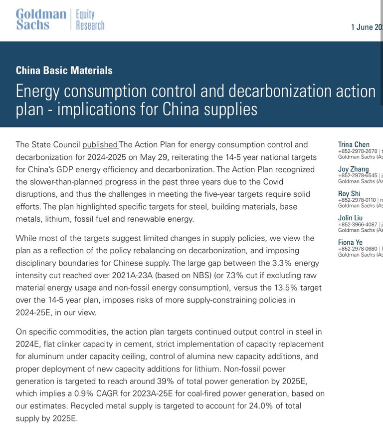 Devlet Konseyi, Çin'in GSYİH enerji verimliliği ve karbonsuzlaştırma için 2024-2025 enerji tüketimi kontrolü ve karbonsuzlaştırma Eylem Planı'nı 29 Mayıs'ta yayınladı. Eylem Planı, Covid-19 aksaklıkları nedeniyle son üç yılda planlanandan daha yavaş ilerlemeyi ve bu nedenle beş yıllık hedeflere ulaşmadaki zorlukları kabul etti. Plan, çelik, yapı malzemeleri, temel metaller, lityum, fosil yakıtlar ve yenilenebilir enerji için belirli hedefleri vurguladı.